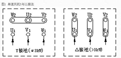 1、單速風機接線方法:一般情況下,所配電機功率在3kW(包括3kW)以下為Y接法;3kW以上為△接法。接線圖如下: