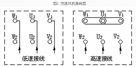 2、雙速風機接線方法:本廠雙速風機所配雙速電機其定子繞組為△/YY(或Y/YY)接法。接線圖如下: